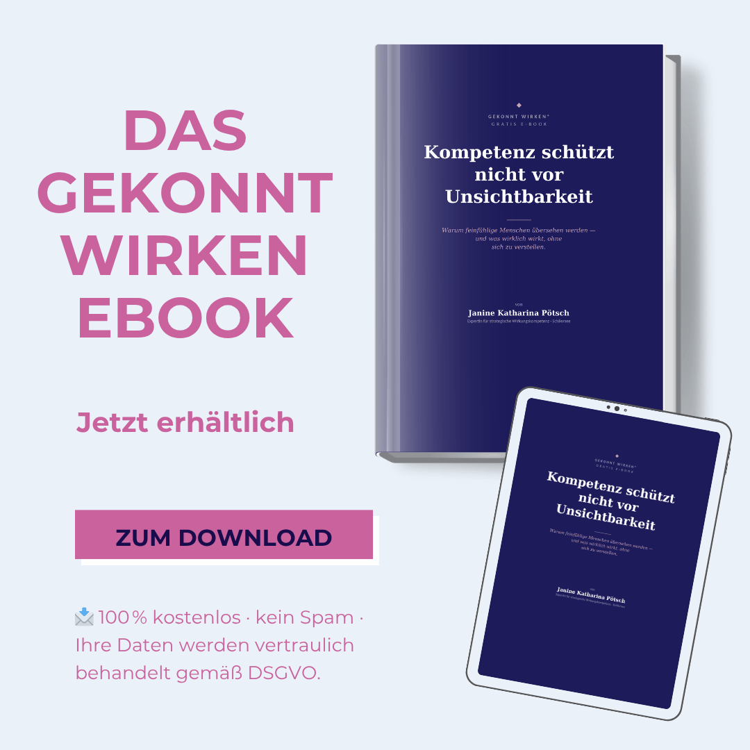 Ich bin Janine Katharina Pötsch, Gründerin von Gekonnt wirken – Expertin für strategische Wirkungskompetenz, Kommunikation und Stil mit psychologischem Tiefgang.