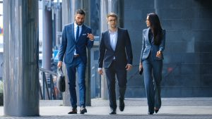 Male and Female Business People Walk and Discuss Business. They’re all Working in Central Business District.